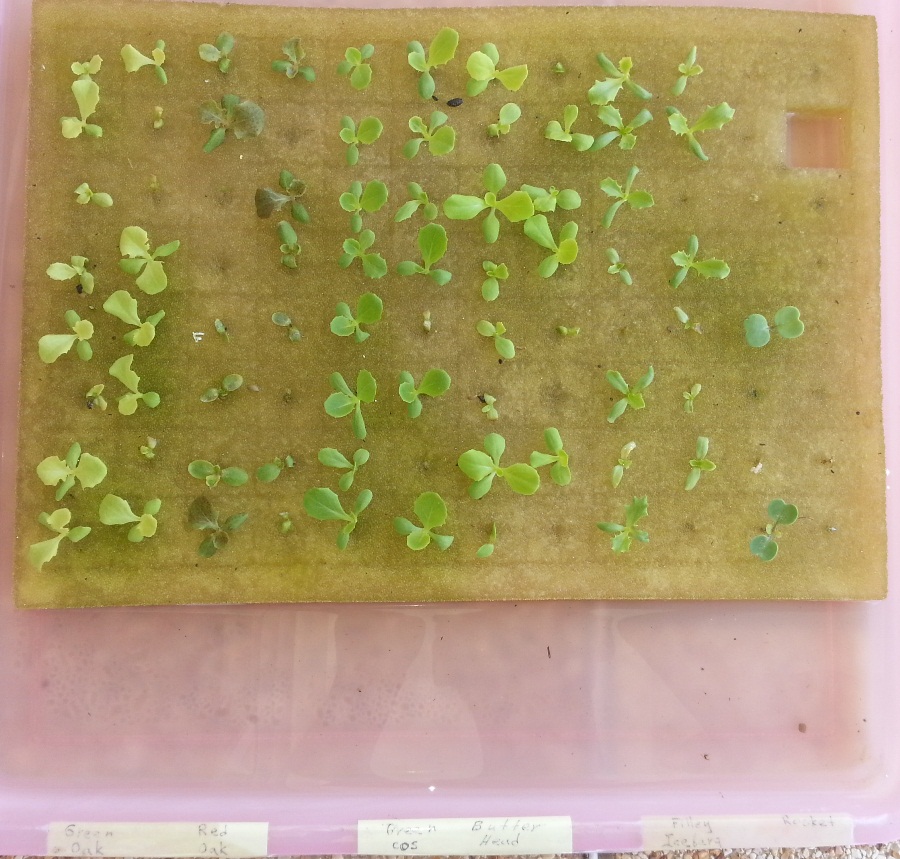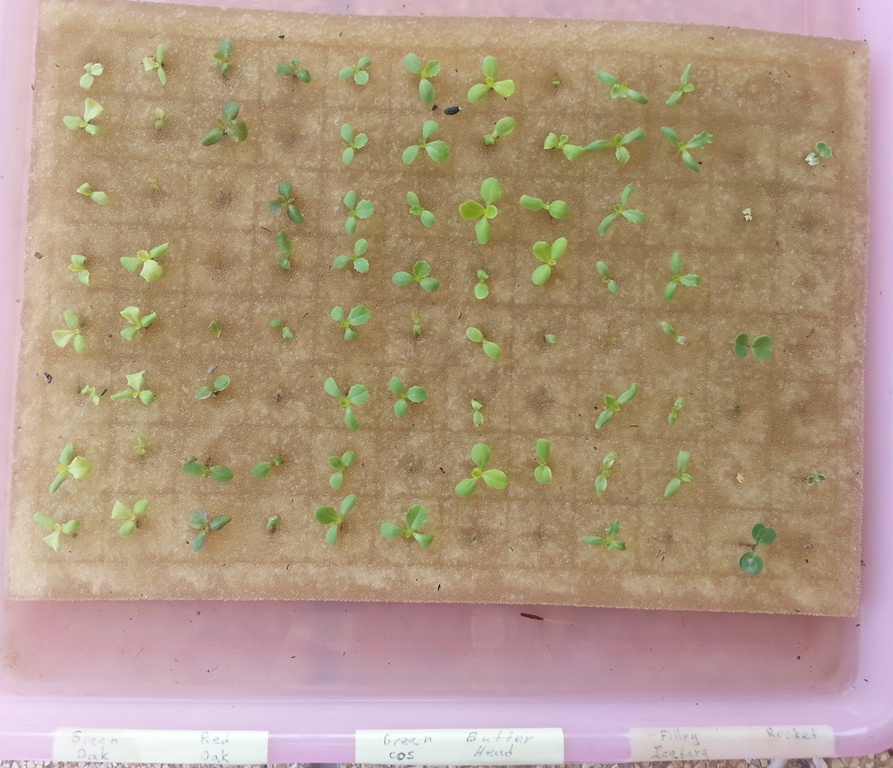 Больше половины семян уже проросли и у них появилось по два листика. Меньше всего проросла моя любимая Руккола. Наверно, потому что он семена были без глины. Хотя рядом у Кочанного салата айсберг тоже не было глины и они хорошо проросли… Не понятно…