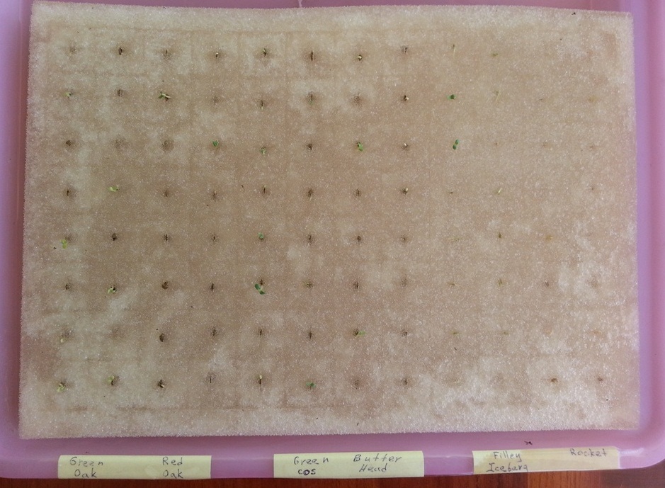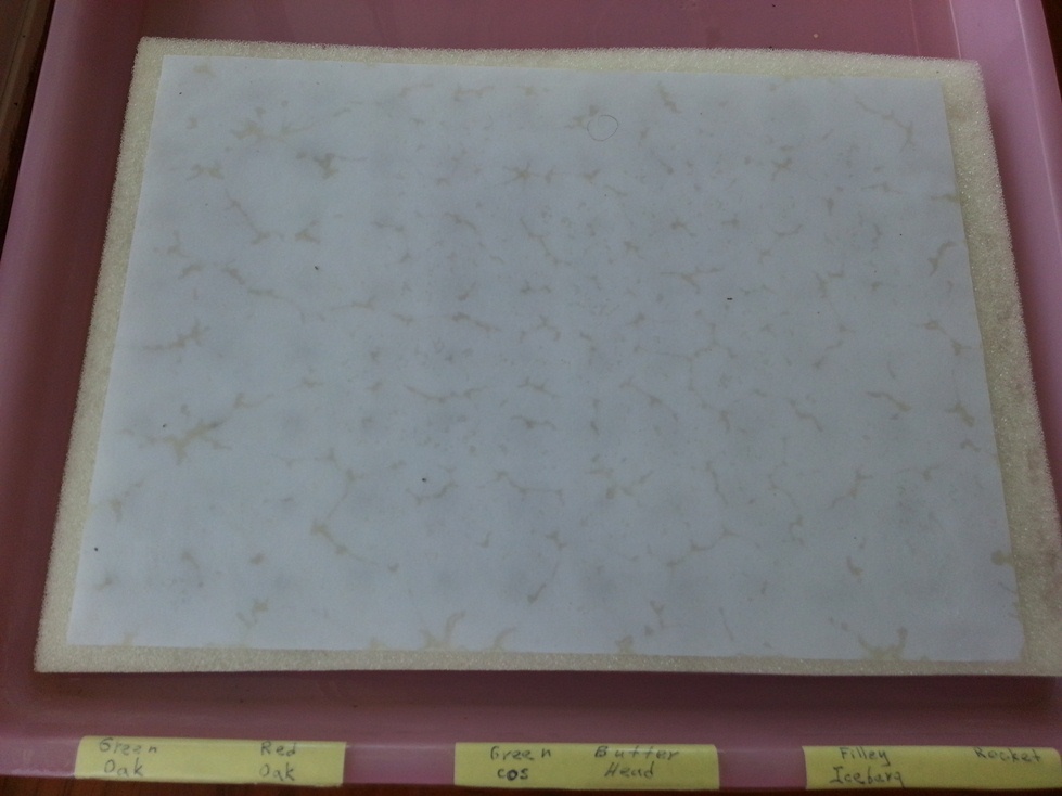 Листок я убрал, чтобы посмотреть на семена — но они не взошли ещё но разбухли. После того как листок убрал — он разорвался и я смочил новый листок водой и положил его сверху, предварительно побрызгав поролон ещё водой. Долил немножко воды.