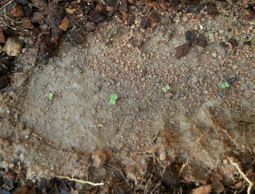 Но руккола почти не растет по непонятныv причинам. В отличие от остальных она вообще не дала ни одного ростка. А вот на улице та же самая руккола имеет уже по 4 листика!!!! Все четыре ростка взошли и превзошли всех своих собратьев из корыта. Хотя грунт тут почти чистая глина: